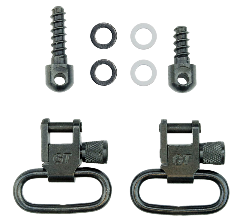 This swivel set includes two 1" GT locking swivels, one 1/2" wood screw fore end stud, one 3/4" wood screw rear stud, and two spacers for mounting sling attachments on rifles. Features black oxide finish steel construction designed for durability and corrosion resistance. The locking swivel mechanism provides secure sling attachment to wood furniture.