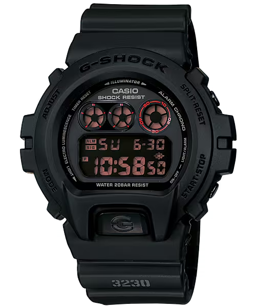 This G-Shock DW6900MS1CR is a digital watch featuring the durable G-Force design in black. It is a men's timepiece suitable for outdoor and tactical use with standard G-Shock shock resistance and water resistance features.