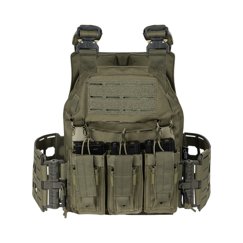 The Apollo One plate carrier from Guard Dog Body Armor is a protective vest system designed to accommodate ballistic plates for personal protection. This OD Green model features a modular design suitable for tactical, law enforcement, or civilian defensive use. The carrier provides secure plate retention and is compatible with standard SAPI-cut or other plate formats.