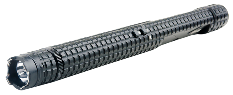The Guard Dog Knightro is an 8,000 volt stun gun designed for personal protection with a built-in tactical light. Constructed from black aluminum, this baton-style stun gun measures 14.9 inches in length and weighs 14.10 ounces for portable self-defense use.
