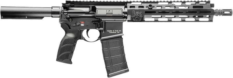 Semi-automatic AR pistol chambered in 5.56 NATO with an 11" threaded barrel and M-LOK free-float handguard. Features a short-stroke gas piston system, adjustable gas block, Picatinny rail receiver, ambidextrous controls, and HK enhanced ergonomic grip. Ships with one 10-round magazine and weighs 6.61 lbs.