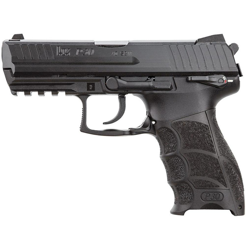 The Heckler & Koch P30S V3 is a .40 S&W semi-automatic pistol with a 3.85" barrel, double/single action trigger, and 10+1 round capacity. Features include night sights, ambidextrous controls, a rear decocking button, interchangeable grip panels, and HK's patented recoil reduction system on a corrosion-proof polymer frame. Includes two 10-round magazines and weighs 1.63 lbs.