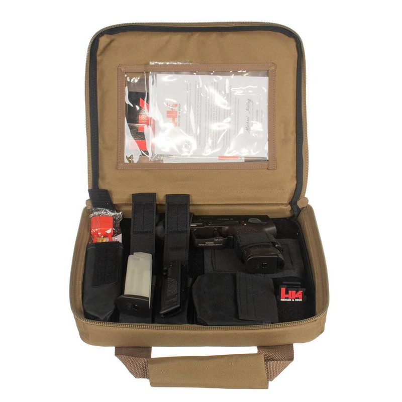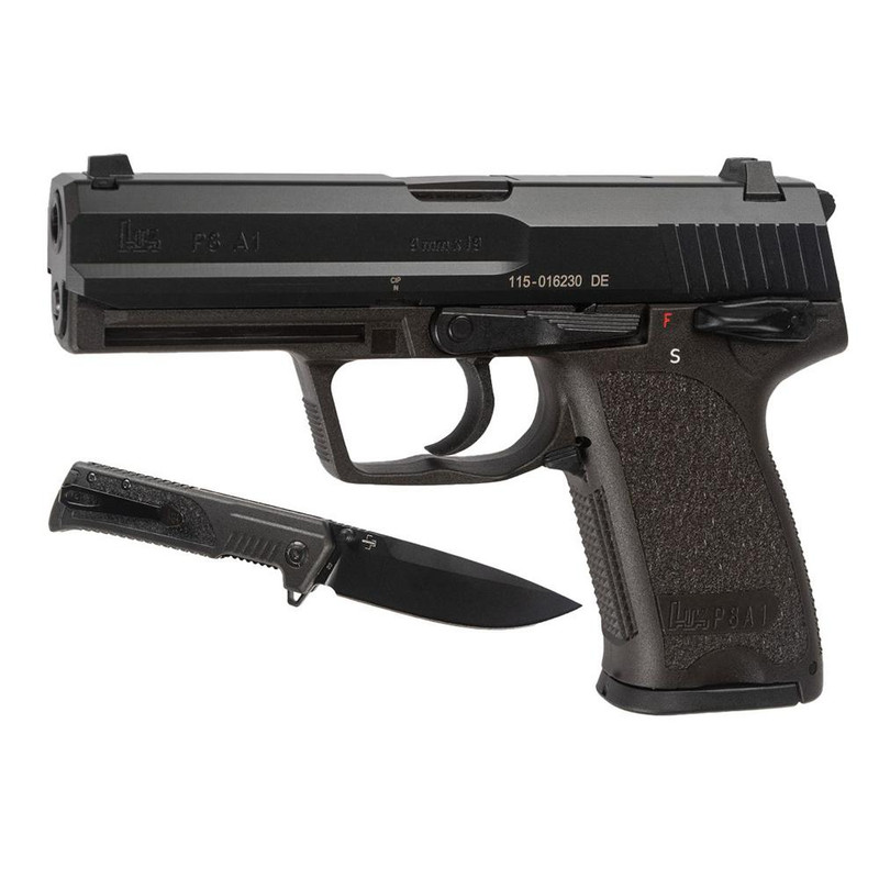 The HK P8 A1 Final Edition is a 9mm Luger DA/SA semi-automatic pistol with a 4.25" barrel and 15+1 capacity. This limited commemorative edition features a black steel barrel, serrated slide, textured grip, and ambidextrous safety lever on a polymer frame with accessory rail. The package includes two 15-round magazines, a tan gun case, and a matching Boker knife.
