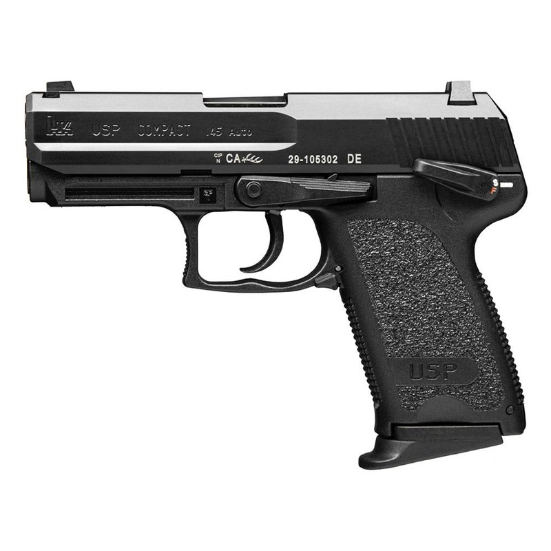 The HK USP Compact V1 is a DA/SA semi-automatic pistol chambered in 9mm Luger with a 3.58" cold hammer-forged polygonal barrel and 13-round capacity. Built on a polymer frame with a matte black nitro-carburized steel slide, fixed 3-dot sights, ambidextrous safety/decocker, and extended slide release. Includes two 13-round magazines and weighs 27.2 oz unloaded.