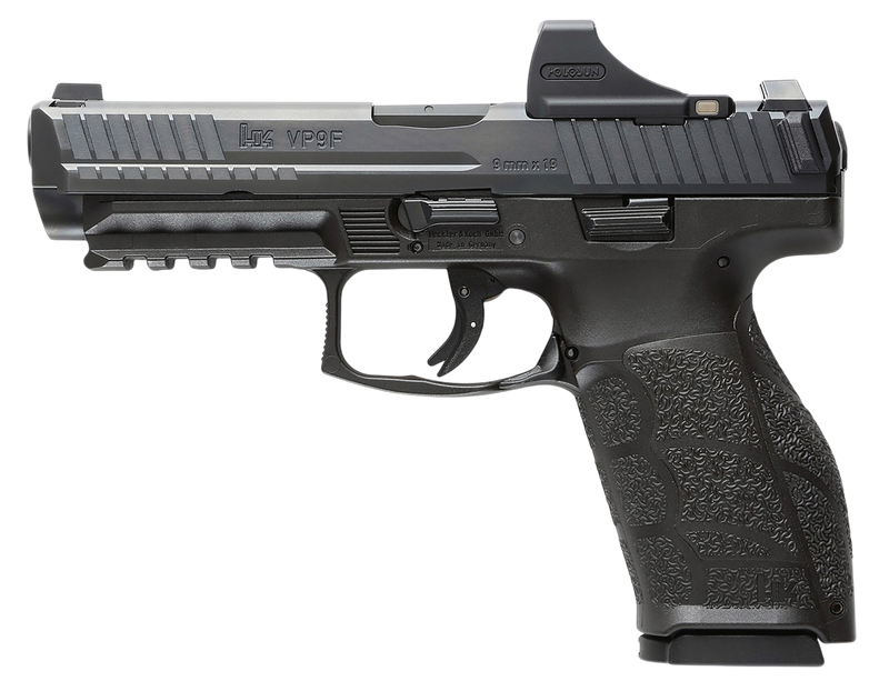 The HK VP9A1 F is a 9mm Luger striker-fired semi-automatic pistol with a 4.5" cold hammer-forged barrel and 10+1 capacity. It features a Holosun SCS optic-ready slide, night sights, ambidextrous controls, interchangeable grip panels, and a polymer frame. This California-compliant model comes with two 10-round magazines and weighs 23.28 oz.