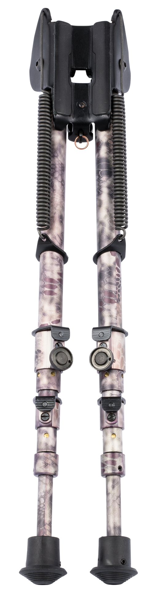 The Harris BR2 is a fixed (non-swivel) bipod designed for bench rest and prone shooting with a vertical adjustment range of 6-9 inches. It features self-leveling legs with rubber feet and attaches via swivel stud to most bolt-action rifles. The bipod is constructed from steel and aluminum for durability and weighs 12.5 oz.