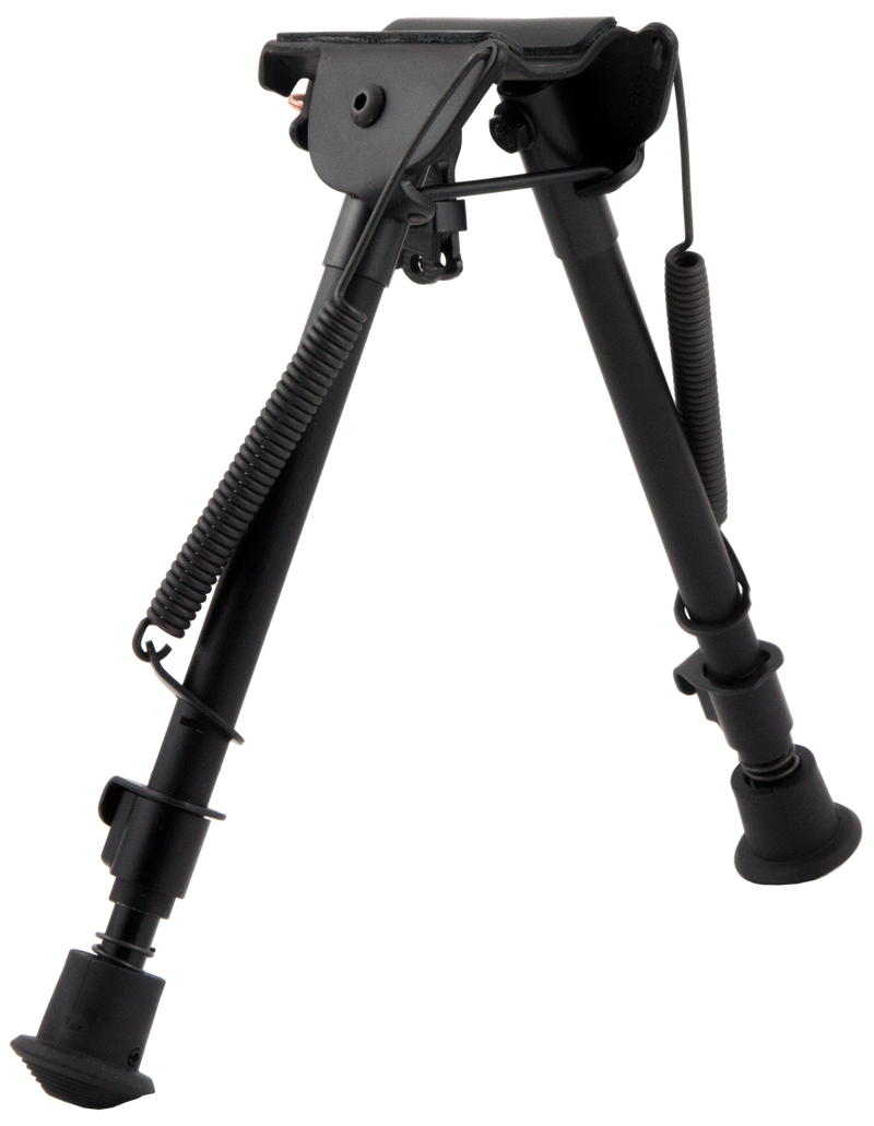 Fixed-base bipod with adjustable height from 9 to 13 inches and leg notches in 1-inch increments for multiple shooting positions. Constructed from steel and aluminum with rubber feet and weighs 10.7 ounces. Spring-loaded legs enable fast deployment and made entirely in the USA.