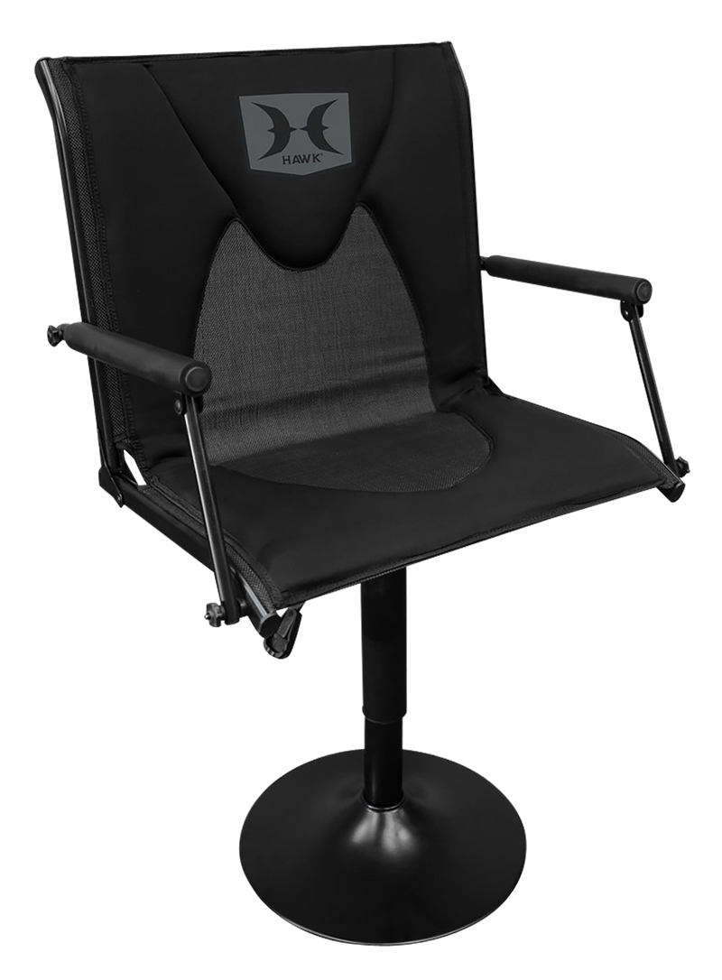 The Hawk Premium Blind Chair is a portable seating solution designed for hunting blinds and tree stands. Constructed with a blend material, it features compact dimensions of 25" L x 22" W x 7" H for easy transport and setup. This accessory provides comfort and stability during extended hunting sessions.