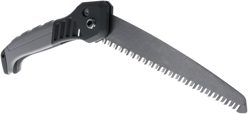 This folding wood saw features a 7.0" SK5 high carbon steel blade with black titanium nitride finish for corrosion resistance and a 3-position opening mechanism controlled by button. The cast aluminum handle with soft TPR grip closes to 8.25" for compact storage and portability. Ideal for camping, survival, and general outdoor cutting tasks.