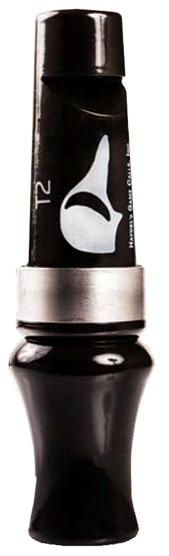 The T2 is a 5-in-1 combination teal duck call made of black acrylic, featuring one end that produces blue-winged and cinnamon teal quacks and the other end for green-winged, pintail, widgeon, and mallard drake whistles. This non-electronic mouth call is designed to attract ducks during waterfowl hunting. The call measures 7.7" in length and is suitable for hunters targeting multiple duck species.