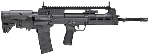 The Springfield Hellion is a 5.56 NATO semi-automatic bullpup rifle with a 20" barrel and 10+1 capacity. It features low profile flip-up sights, a threaded barrel with 4-prong flash hider, ambi charging handle, and a 5-position adjustable stock. The rifle weighs 8 lbs 6 oz and has an overall length of 32.25" to 33.75" depending on stock position.
