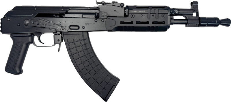The Pioneer Arms Hellpup is a 7.62x39 semi-automatic pistol featuring an 11.73" nitride barrel with a gas piston operating system and manual safety. It includes a UTG Pro drop-in M-LOK handguard, adjustable rear blade sight, front post sight, and comes with two 30+1 round magazines. The firearm has a steel frame, weighs 108 ounces, and measures 23" overall with a threaded barrel for muzzle device compatibility.