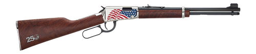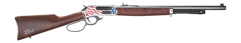 This Henry lever-action rifle is chambered in 45-70 Government with a 22" octagon blued barrel and 4+1 capacity. Features a fancy American walnut straight-grip stock, adjustable semi-buckhorn rear sight with diamond insert, brass bead front sight, and an American flag cerakote receiver. Drilled and tapped for scope mounting, with an engraved silver 250th anniversary logo and weighs 8.1 lbs.