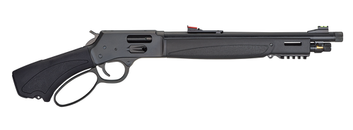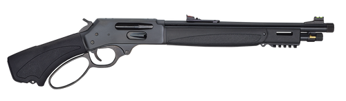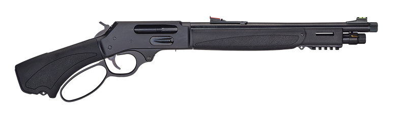 The Henry Bear's Leg is a lever-action pistol chambered in 45-70 Government with a 13.8" threaded barrel (5/8x24 thread pitch) and 3+1 capacity. Features a blued steel receiver, black synthetic pistol grip stock, adjustable semi-buckhorn rear sight with diamond insert, and brass bead front sight. Drilled and tapped for optics, this specialty handgun weighs 6.59 lbs with a 25.1" overall length.