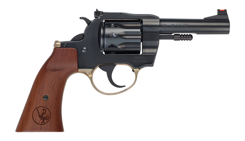 Double/Single action revolver chambered in .22 S/L/LR with a 4" round blued barrel and 10-round capacity. Features a polished blued steel frame, American walnut gunfighter grip, fully adjustable rear sight, and ramped fiber bead front sight. Overall length is 9.5" and weighs 37 oz.