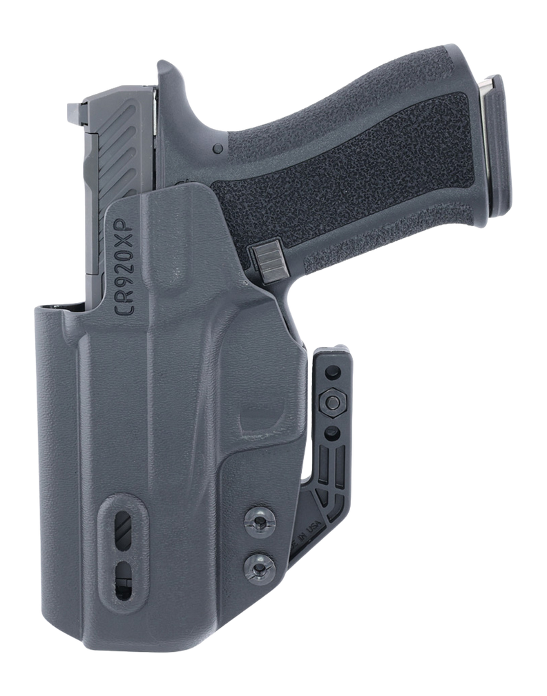 Ambidextrous inside-the-waistband (IWB/AIWB) holster designed for the Shadow Systems CR920XP. Features an open muzzle, symmetrical ambi mid-height sweatguard, and generous clearance for optics and suppressor-height sights. Compatible with both Discreet Carry Concepts clips and the PHLster Enigma system.