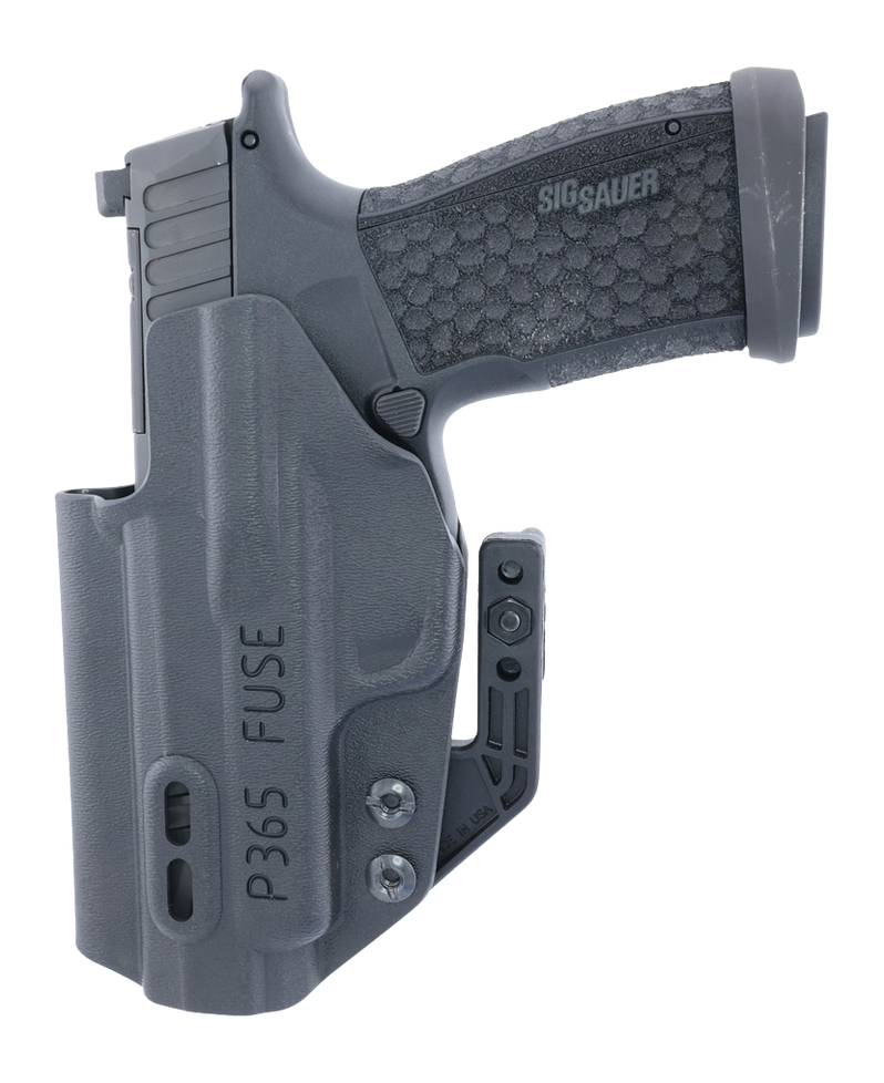 Ambidextrous inside-the-waistband (IWB) and appendix inside-the-waistband (AIWB) holster designed for the Sig P365 Fuse. Features compatibility with Discreet Carry Concepts clips and PHLster Enigma system, open muzzle design, and generous clearance for optics and suppressor-height sights. The slim profile includes a symmetrical ambi mid-height sweatguard for comfortable concealed carry.