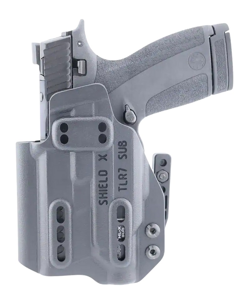 This is a precision-crafted inside-the-waistband (IWB) and appendix inside-the-waistband (AIWB) holster designed specifically for the Smith & Wesson M&P Shield X pistol equipped with a Streamlight TLR-7 Sub weapon light. The holster features an ambidextrous draw, adjustable retention, and is constructed for all-day concealed carry comfort. California Proposition 65 warning applies.