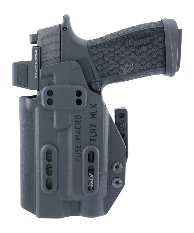 The Ember is an AIWB/IWB concealed carry holster designed for the Sig P365 Fuse or P365 X Macro equipped with a Streamlight TLR-7 HLX weapon light. It features an ambidextrous draw, adjustable design for all-day comfort, and discreet concealment. This holster is precision-crafted for versatile carry options that adapt to your lifestyle.