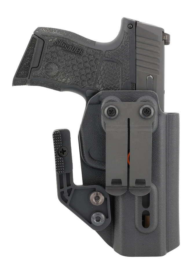 The Flint Comp is a partial holster designed specifically for the Sig Sauer P365 platform. This holster accommodates compensated/competition slides and offers a secure, minimalist design. Dimensions are approximately 11.6" L x 6.9" W x 2.1" H.
