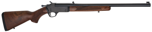 Break-action single shot rifle chambered in .44 Rem Mag with a 22" round blued barrel and American walnut stock. Features adjustable semi-buckhorn rear and brass bead front sights, drilled and tapped for scope mounting, with a 14" length of pull and black rubber recoil pad. Weighs 6.96 lbs with an overall length of 37.5".