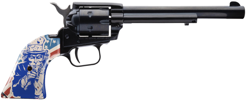 Single-action revolver chambered in .22 LR with a 6.5" barrel and 6-round capacity. Features a zinc alloy frame and cylinder with black oxide finish, fixed front and notched rear sights, and custom Uncle Sam grips. Weighs 33.4 oz with an overall length of 11.78".