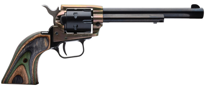 Single-action rimfire revolver chambered in .22 LR/.22 WMR with a 6.50" blued barrel and 6-round cylinder. Features a simulated case hardened zinc alloy frame, camo laminate grip panels, fixed front/notched rear sights, and hammer/thumb safety. Weighs 30.6 oz with an overall length of 11.78".