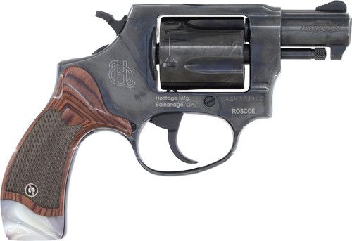 The Heritage Roscoe is a compact double/single action revolver chambered in 38 Special with a 2" blued barrel and fixed sights. It features rosewood and white pearl grips, an alloy frame, and holds 5 rounds. This TALO exclusive model weighs 22-26 oz and has an overall length of 6.5".