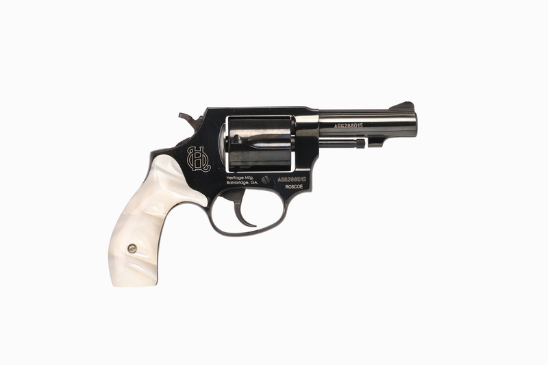 The Heritage Roscoe is a .38 Special double/single-action revolver featuring a 3" barrel and 5-round capacity. It has a lightweight alloy frame, fixed sights, and white pearl grips, with an overall length of 6.5" to 7.5" and weighing approximately 22-26 oz. This compact revolver includes a transfer bar safety and comes with a polished black finish.