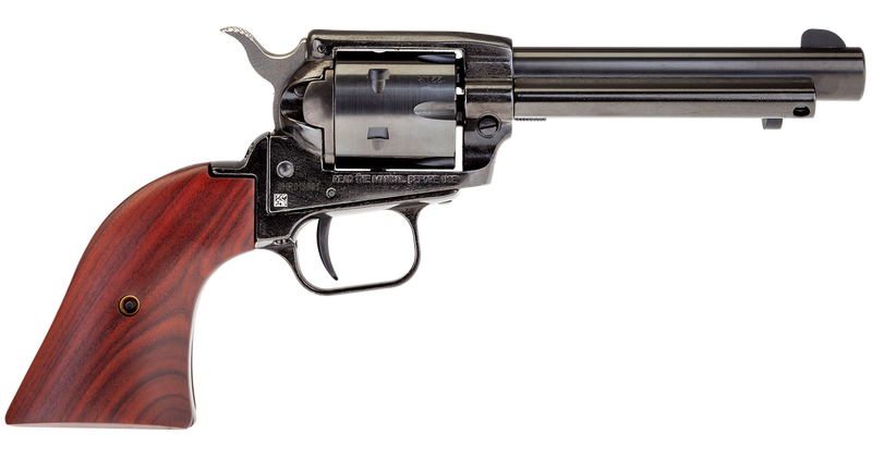 Single-action rimfire revolver chambered in .22 LR with a 4.75" blued or black steel barrel and alloy frame. Holds 6 rounds, features cocobolo grips, fixed sights, exposed hammer, and weighs approximately 30-33 oz. Classic Old West styling in a scaled-down rimfire platform.