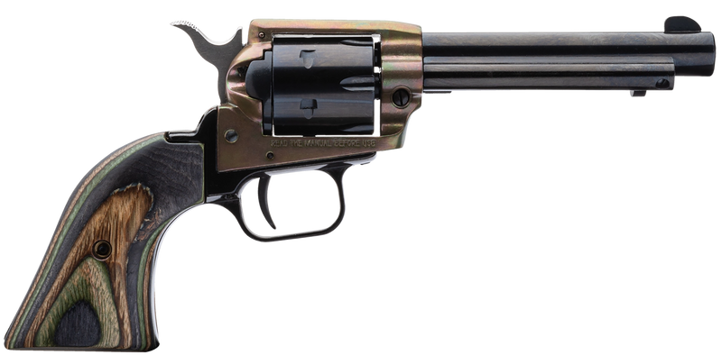 Single-action revolver chambered in .22 LR with a 4.75" barrel and 6-round capacity. Features a simulated case hardened zinc alloy frame, black oxide steel barrel, fixed sights, exposed hammer, manual safety, and camo laminate grips. Weighs approximately 30 oz with an overall length of 10.1".