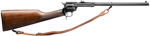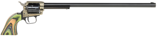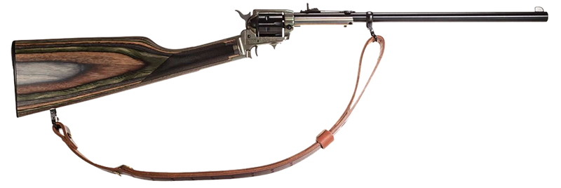 Heritage Rough Rider Rancher single-action revolver rifle chambered in .22 LR with a 16" barrel and 6-round capacity. Features a color case hardened or blued steel receiver with camo laminate wood stock, adjustable buckhorn sights, and includes a leather sling. Weighs approximately 4.1 lbs with an overall length of 32".