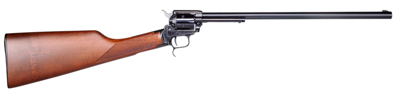 The Heritage Rough Rider Rancher Carbine is a .22 LR single-action rifle with a 16" barrel and 6-round capacity, bridging the gap between traditional rifle and revolver design for simplicity and portability. It features a black oxide finish, fixed front and notched rear sights, walnut stocks, and an aluminum alloy frame. The rifle weighs 4.12 lbs with an overall length of 32".