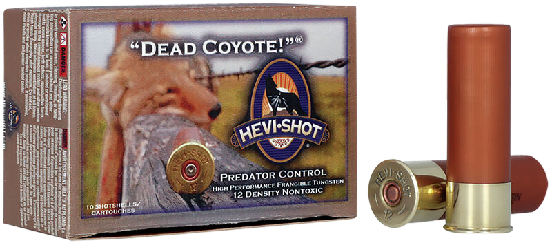 HEVI-Shot Dead Coyote is a 12 gauge 3" shotshell loaded with 1.5 oz of frangible tungsten pellets (#T shot) at 1300 fps, designed specifically for predator hunting on coyotes out to 70 yards. The 12 g/cc pressed tungsten pellets deliver superior downrange energy and dense patterns compared to standard predator loads. This ammunition features non-sparking frangible shot in plastic casings and comes as 10 rounds per box.