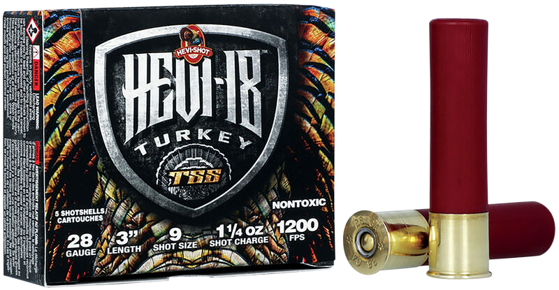 HEVI-Shot HEVI-18 TSS Turkey loads are designed for long-range turkey hunting with 28 gauge, 3" shells containing 1-1/4 oz of #9 tungsten shot at 1200 fps. The 18 g/cc density tungsten pellets provide superior pattern density and lethality compared to lead, allowing hunters to use smaller shot sizes while maintaining downrange effectiveness. This is a 5-round box packaged as 10 boxes per case.