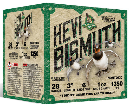 HEVI-Shot HEVI-Bismuth 28 gauge shotshells loaded with 1 oz of bismuth shot in size 6, designed for waterfowl hunting. These 2.75" shells deliver 1350 fps muzzle velocity and come 25 rounds per box in plastic cases.