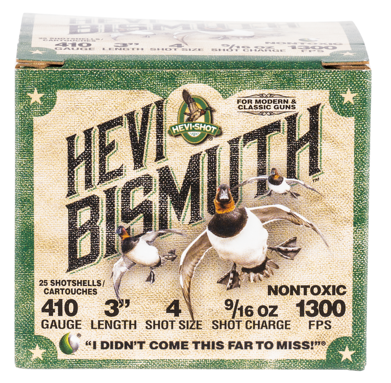 HEVI-Shot HEVI-Bismuth 410 gauge shotshells are designed for waterfowl hunting with bismuth shot that provides superior performance as a non-toxic alternative. These 3" shells contain 9/16 oz of #4 shot and achieve 1300 fps muzzle velocity from a plastic case with high brass primer. Ideal for hunting applications where non-toxic shot is required or preferred.