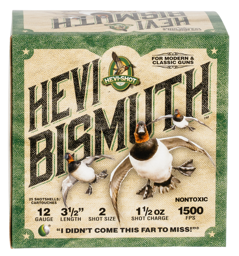 HEVI-Shot HEVI-Bismuth shotshells in 12 gauge 3.5" magnum with 1.5oz of bismuth shot size #2, loaded to 1500 fps. Designed for waterfowl hunting, bismuth is 22% denser than steel, allowing shooters to drop down a shot size while maintaining lethality. Safe to use in both modern and classic shotguns.