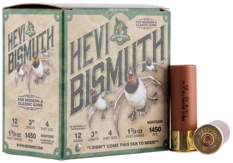 HEVI-Shot HEVI-Bismuth shotshells are loaded with bismuth shot that is 22% denser than steel, allowing you to drop down a shot size while maintaining lethality. These 12 gauge 3" shells deliver 1 3/8oz of #4 shot at 1450 fps and are safe to shoot in both modern and classic shotguns. Ideal for waterfowl hunting applications.