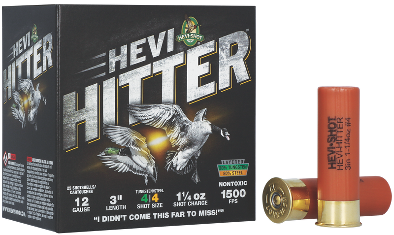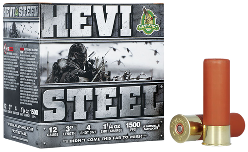 HEVI-Shot HEVI-Hitter is a 12 gauge 3" shotshell loaded with 1-1/4 oz of shot in #4 size, featuring a tungsten/steel blend (20% tungsten, 80% steel) for waterfowl hunting. This load achieves 1500 fps velocity and is designed to deliver superior pattern density and lethality on ducks and geese at both close and moderate ranges.