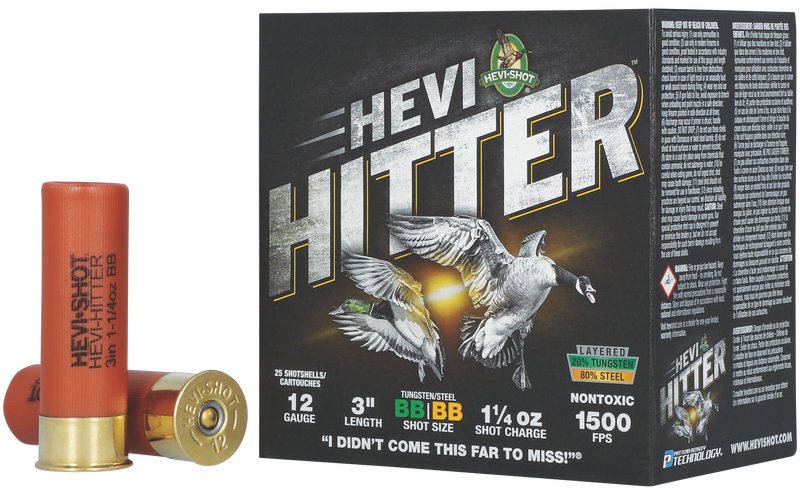 HEVI-Shot HEVI-Hitter 12 Gauge 3" shotshells feature a tungsten/steel blend with 20% tungsten and 80% steel shot in BB size, traveling at 1500 fps. Designed for waterfowl hunting, these rounds deliver effective patterns at close to moderate ranges while providing the pellet density needed for distant birds. Each box contains 25 rounds in a plastic casing.