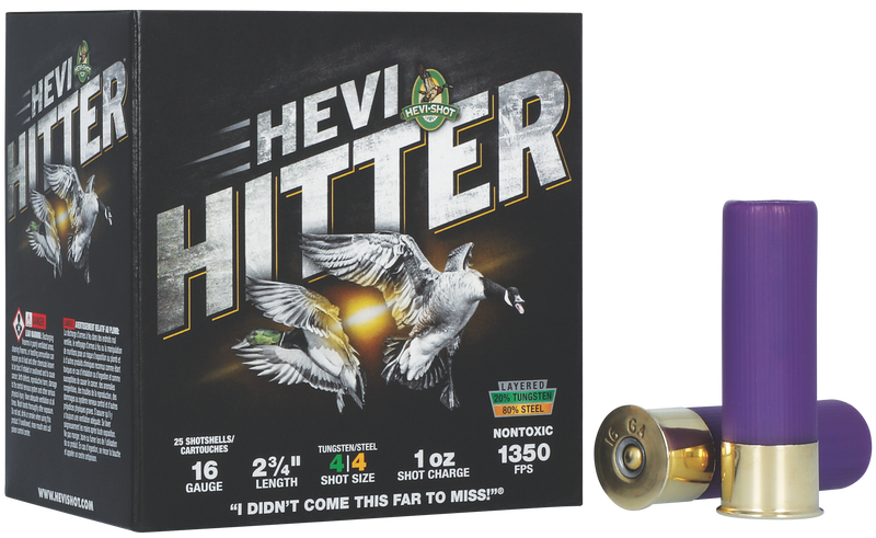 HEVI-Shot HEVI-Hitter shotshells deliver a tungsten and steel blend specifically engineered for waterfowl hunting. Each 16 gauge round contains 1 ounce of #4 shot (20% tungsten, 80% steel) loaded to 1350 fps in plastic casings for reliable performance on ducks and geese at varying distances.