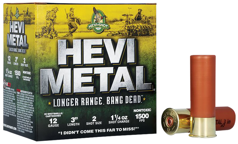 HEVI-Metal Longer Range shotshells are 12 gauge 3" loads designed for extended-range waterfowl hunting. Each round contains 1-1/4 oz of shot combining 30% high-density HEVI-Bismuth alloy pellets with 70% corrosion-resistant steel shot, delivering increased downrange power and tighter patterns at 1500 fps muzzle velocity.