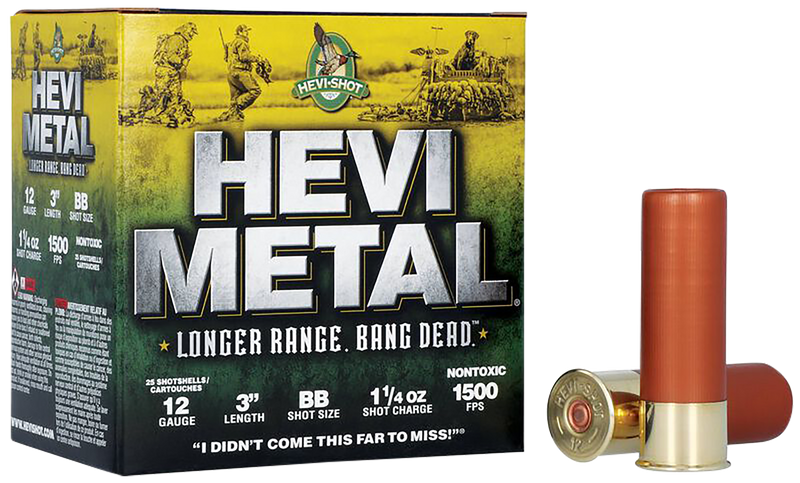 HEVI-Metal Longer Range shotshells are 12 gauge 3" loads with 1 1/4 oz of BB shot designed for waterfowl hunting at extended ranges. The shells feature a HEVI-Bismuth and steel shot blend that increases downrange power by 16 percent with 30 percent HEVI-Bismuth pellets layered over corrosion-resistant steel, delivering tighter patterns and cleaner kills. Loaded to 1500 fps velocity.