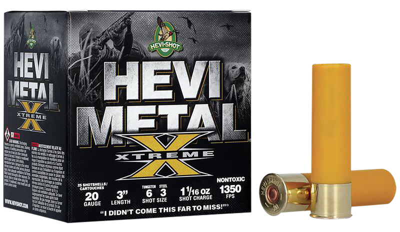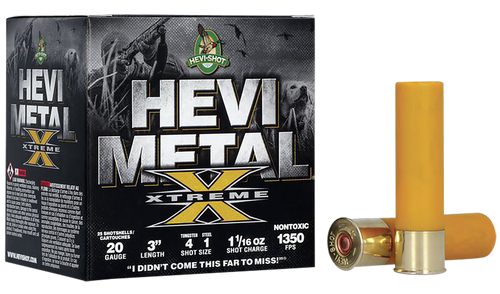 HEVI-Shot HEVI-Metal Xtreme 20 gauge shotshells deliver a 30% tungsten leading layer over 70% steel pellets for hard-hitting performance at 1350 fps. Designed for hunting with FliteControl Flex wad technology for consistent patterns. High brass plastic cases, 25 rounds per box.