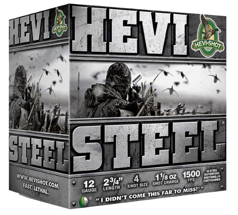 HEVI-Steel shotshells designed for waterfowl hunting with 12 gauge, 2.75" plastic casing and #4 steel shot. These high brass shells deliver 1500 fps velocity with 1 1/8 oz of shot, providing effective performance for waterfowl applications.