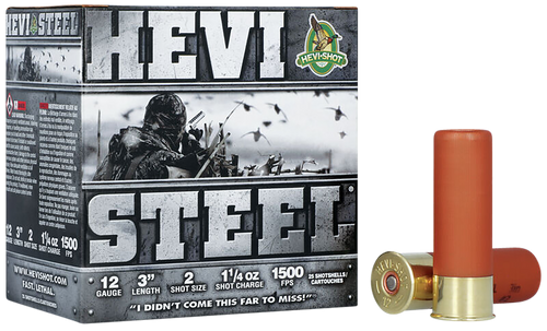 Hevi-Shot Hevi-Steel shotshells are 12 gauge 3-inch shells loaded with 1 1/4 ounces of #4 steel shot, designed for waterfowl hunting. These non-toxic steel shells deliver 1500 fps muzzle velocity and precise pattern density for reliable field performance.