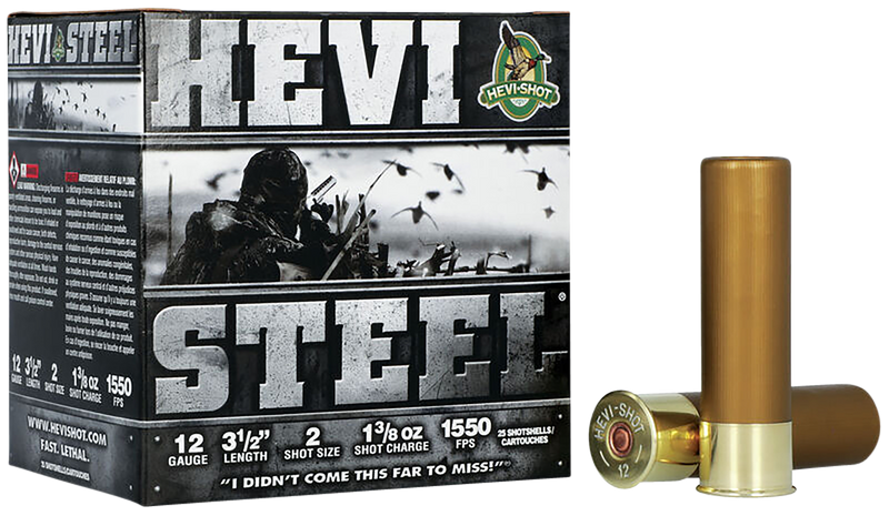 HEVI-Shot HEVI-Steel is an all-steel shotshell designed for waterfowl hunting, loaded with 1 3/8 oz of #2 shot in 3.5-inch shells. It delivers a muzzle velocity of 1550 fps for increased knockdown power and consistent patterns on ducks and geese.