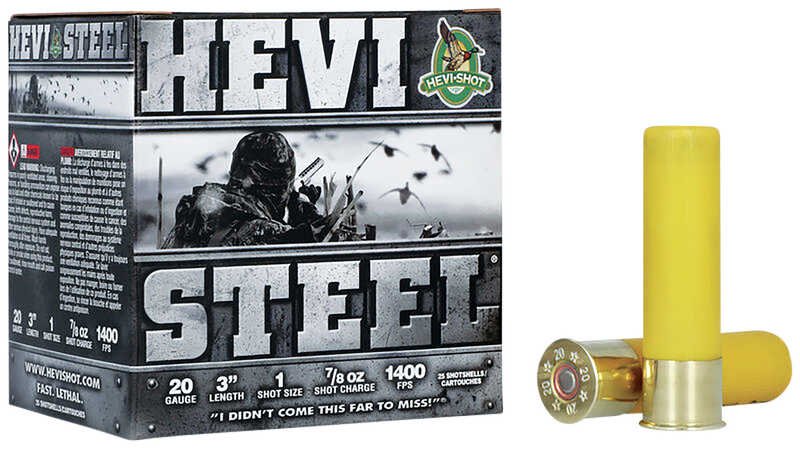 HEVI-Shot HEVI-Steel shotshells are 20 gauge 3" loads featuring 7/8 ounce of #1 steel shot at 1400 fps muzzle velocity. Designed for waterfowl hunting with high brass plastic cases. These shells deliver effective range and pattern density for duck and goose hunting applications.