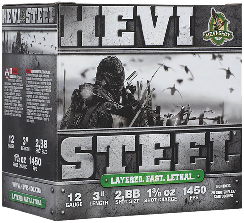 HEVI-Steel Upland shotshells are loaded to 1350 fps with precision steel pellets in #3 shot size, designed for upland bird hunting. The plastic casing and specialized wad produce tight patterns for improved accuracy on fast-flying game like dove and quail. Each box contains 25 rounds with 209 primers.